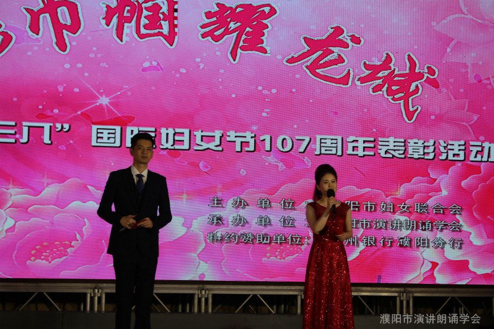 受市妇联委托,濮阳市演讲朗诵学会全程参与此次活动。学会会长许清林应邀创作主题诗《春天的歌唱》。副会长解瑞民、张红丽、刘俊军、李洪亮,副秘书长赵风华组成导演组,副秘书长兼办公室主任张凤英任剧务主任,常务理事、艺术总监助理孟慧娜担纲主持,从活动方案策划到筛选指导节目到创作主题诗歌,在此次全市重大的综合表彰活动中展现出学会在导演、指导、创作方面的能力。同时,也积累了举行大型综合活动的宝贵经验。